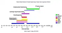 Instead of describing the abnormalities in structure and form, research focuses nowadays at decoding the molecular interactions that underlie them.[3] Based on data from quantitative real-time PCR on samples of suture junctions during development, cranial suture fusion in mammals is a tightly orchestrated expression of genes in specific temporal order, leading to endochondral ossification.[38] Despite the progress that has been made, many things are still not understood about the suture biology and the exact causative pathways remain yet to be completely understood.[39]