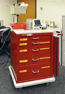 A crash cart or code cart (crash trolley in UK medical jargon) or "MAX cart" is a set of trays/drawers/shelves on wheels used in hospitals for transportation and dispensing of emergency medication/equipment at site of medical/surgical emergency for life support protocols (ACLS/ALS) to potentially save someone's life. The cart carries instruments for cardiopulmonary resuscitation and other medical supplies while also functioning as a support litter for the patient.