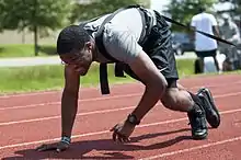 The crab crawl is used in crab soccer. It starts by sitting down with the feet and hands flat on the ground, the hips are then raised off the ground and the chest faces the sky. It is similar to a bridge walk in that both have quadrupedal locomotion with a supine torso, but here the arms are held behind the torso, with the shoulder joint being in hyperextension. Due to its inefficiency, it is more commonly used as a form of exercise than actual transportation. Crabwalking builds triceps endurance[4] and arm and leg strength, and is a recommended exercise of various school athletic departments and soccer organizations, such as USA football.[5]