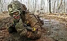 The leopard crawl is a military-specific crawl. There are two versions, the leopard crawl proper and a modified version for when carrying weapons in the hands. This is a two-beat gait like a trot: an arm/elbow is advanced with the diagonal knee. This is designed for the smallest silhouette possible, and the body is often nearly or actually touching the ground, and although the elbow and knee are the main focus, most of the respective limbs touch the ground.