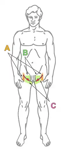 Area A (in orange) represents the area of sensory fibers controlled by the genitofemoral nerve; area B (in green) represents that controlled by the ilioinguinal nerve; arrow C (in red with blue outline) shows the direction and location where the skin must be stroked to elicit this reflex.
