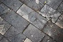 Creosoted wood blocks were a common road-paving material in the late 19th and early 20th centuries, but ultimately fell out of favor because they did not generally hold up well enough over time.[69][70][71][72]