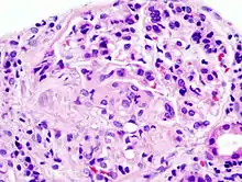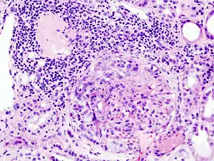 It may occur as a result of anti-glomerular basement membrane disease, granulomatosis with polyangiitis, microscopic polyangiitis, lupus nephritis, IgA nephropathy, and following infection.[3] Diagnosis is based on blood tests, urine tests, and a kidney biopsy.[2] The biopsy show crescent-shaped scaring in over half the glomeruli.[3]
