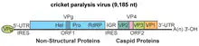 The spheroidal, non-enveloped virus particles of CrPV are about 27 nm diameter in negatively-stained electron micrographs and contain a single piece of positive-sense ssRNA. The virion is composed of four capsid proteins with molecular masses generally reported to be 33, 31 and 30 kilodaltons with a minor VP4 protein of about 8 kDa. The particles resemble those of the mammalian picornaviruses but CrPV virions sediment at a faster rate (167 S) than poliovirus particles (158 S) in sucrose rate-zonal gradients and, in isopycnic neutral cesium chloride gradients, CrPV particles are denser than those of poliovirus (1.368 g/cm3 vs 1.340 g/cm3 respectively).[2][3][4]