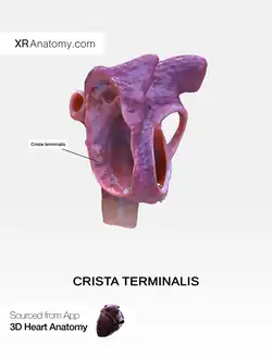 The crista terminalis (also known as the terminal crest, or crista terminalis of His[1]) is a vertical ridge on the[2]: 56 posterolateral[3] inner surface of the adult right atrium extending between the superior vena cava, and the inferior vena cava.[2]: 56 The crista terminalis denotes where the junction of the embryologic sinus venosus and the right atrium occurred during embryonic development.[3] It forms a boundary between the rough[2]: 56 trabecular[4] portion and the smooth, sinus venosus-derived portion (sinus venarum) of the internal surface of the right atrium. The sinoatrial node is located within the crista terminalis.[2]: 56