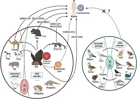 - ↑ Li, Qian; Shah, Taif; Wang, Binghui; Qu, Linyu; Wang, Rui; Hou, Yutong; Baloch, Zulqarnain; Xia, Xueshan (2023). "Cross-species transmission, evolution and zoonotic potential of coronaviruses". Frontiers in Cellular and Infection Microbiology. 12. doi:10.3389/fcimb.2022.1081370/full. ISSN 2235-2988.