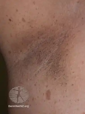 Axillary freckling also occurs in other disease processes that closely resemble NF1, such as Legius syndrome (cafe-au-lait spots, axillary freckling, and macrocephaly without Lisch nodules, neurofibromas or CNS tumors), and, homozygous HNPCC mutations (cafe-au-lait spots, axillary freckling, and cutaneous neurofibromas in the setting of Hereditary Non-Polyposis Colon Cancer, also known as Lynch syndrome; seen with family history of HNPCC and consanguinity).[2]