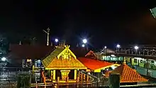 Sabarimala Temple is situated at the place of that name in Pathanamthitta District, Kerala.[71] Women of reproductive age were not permitted to worship there; the ban was said to be out of respect to the celibate nature of the deity to whom it is dedicated, Shasta, an underage teenage male.[72] A Kerala high-court judgement had legalized this interpretation, and forbade women from entering the temple since 1991.[73] In September 2018, a judgement of the Supreme Court of India ruled that all Hindu pilgrims regardless of gender can enter. The Constitution bench of the Supreme Court held that any exception placed on women because of biological differences violates the Constitution – that the ban violates the right to equality under Article 14.[74][75][76][77][78] This verdict led to protests, demonstrations and violence by millions of Ayyappa devotees (both male and female) supported by the Hindu right-wing Bharatiya Janata Party and opposed by the LDF led state government.[79] About ten women attempted to enter Sabarimala, despite threats of physical assault, but failed to reach the sanctum sanctorum.[80][81] Defying such protests, two women activists belonging to the previously barred age group associated with the ruling Communist Party of India (Marxist) finally entered the temple through the rear gate, on the early hours of 2 January 2019, with the help of police and local administration. When this alleged action was brought to the notice of the temple priests and authorities, the temple was closed for ritual purification.[82][83] Controversy regarding the implementation of this verdict continues.