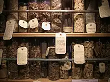 One of the best known means by which the cunning folk opposed witchcraft was through the use of witch bottles; ceramic bottles containing such items as urine, nails, hair and nail clippings which it was believed, when put together, would cause harm to the malevolent witch.[25] Another commonly used method was to take the heart of an animal, and to pierce it with pins, to do harm to the witch, whilst other cunning folk preferred to make dolls of the witch out of rags and other materials and then pierce them with pins, again with the intention of inflicting physical harm on the witch, and breaking their bewitchment.[26]