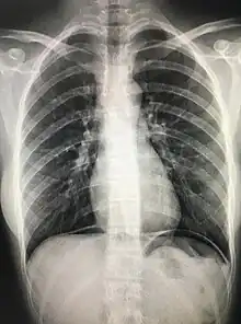 It refers to dependent air that rises within the abdominal cavity of the supine patient to accumulate underneath the central tendon of the diaphragm in the midline. It is seen as lucency overlying the lower thoracic vertebral bodies. The superior border is well defined, but the inferior margin is not.
