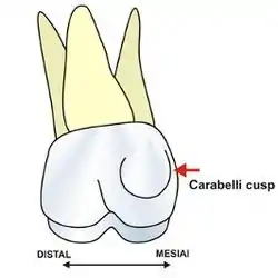 The cusp of Carabelli, Carabelli's tubercle, or tuberculum anomale of Georg Carabelli is a small additional cusp at the mesiopalatal line angle of maxillary first molars. This extra cusp is usually found on the secondary maxillary first molars and is rarely seen on primary maxillary second molars even less likely on other molars.[1] This cusp is entirely absent in some individuals and present in others in a variety of forms. In some cases, the cusp of Carabelli may rival the main cusps in size. Other related forms include ridges, pits, or furrows. This additional cusp was first described in 1842 by the Hungarian Georg Carabelli (Carabelli György), the court dentist of the Austrian Emperor Franz.