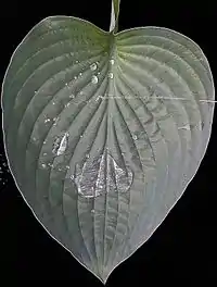 Epicuticular wax covering the cuticle of a leaf of Hosta sieboldiana makes it hydrophobic. Water, unable to wet the cuticle, beads up and runs off, carrying dust and soluble contamination with it. This self-cleaning property is variously called "ultrahydrophobicity" or "ultralyophobicity" in technical journals. More popularly it is known as the Lotus effect.