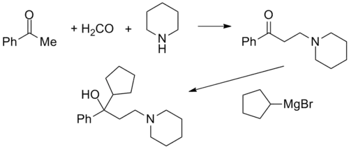 - ↑ Denton JJ, Schedl HP, Lawson VA, Neier WB (1950). "Antispasmodics. VII.1 Additional Morpholinyl and Piperidyl Tertiary Alcohols". Journal of the American Chemical Society. 72 (8): 3795–3796. doi:10.1021/ja01164a127.