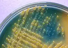 CLED agar (cystine–lactose–electrolyte-deficient agar or medium) is a valuable non-inhibitory growth medium used in the isolation and differentiation of urinary microbes. It contains cystine and lactose and is electrolyte-deficient; the latter trait prevents the swarming of Proteus species. Cystine promotes the formation of cystine-dependent dwarf colonies. Bromothymol blue is the indicator used in the agar, it changes to yellow in case of acid production during fermentation of lactose or changes to deep blue in case of alkalinization. Lactose-positive bacteria build yellow colonies. Bacteria which decarboxylate L-cystine cause an alkaline reaction and build deep blue colonies.[1]