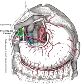 The cystic artery lies within the hepatobiliary triangle, which is used to locate it during a laparoscopic cholecystectomy.[4][5] It may also contain an accessory right hepatic artery or an anomalous sectoral bile ducts. As a result, dissection in the triangle of Calot is ill-advised until the lateral-most structures have been cleared and identification of the cystic duct is definitive. According to SESAP 12 (produced and distributed by the American College of Surgeons) dissection in the triangle of Calot is the most common cause of common bile duct injuries.