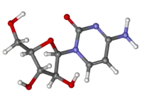 Cytosine arabinoside combines a cytosine base with an arabinose sugar. It is an antimetabolic agent with the chemical name of 1β-arabinofuranosylcytosine. Certain sponges, where it was originally found, use arabinoside sugars to form a different compound (not part of DNA). Cytosine arabinoside is similar enough to human deoxycytosine to be incorporated into human DNA, but different enough that it kills the cell. Cytosine arabinoside interferes with the synthesis of DNA. Its mode of action is due to its rapid conversion into cytosine arabinoside triphosphate, which damages DNA when the cell cycle holds in the S phase (synthesis of DNA). Rapidly dividing cells, which require DNA replication for mitosis, are therefore most affected. Cytosine arabinoside also inhibits both DNA[12] and RNA polymerases and nucleotide reductase enzymes needed for DNA synthesis. Cytarabine is the first of a series of cancer drugs that altered the sugar component of nucleosides. Other cancer drugs modify the base.[13]
