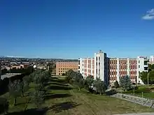 D'Annunzio University's 48.9 acres (19.8 ha) main campus is centered on Madonna delle Piane in Chieti Scalo, about 3 miles (5 km) northwest of downtown Chieti. Its facilities are organised within a unitary structure which includes natural elements and pre-existing buildings.[27] It is the statutory seat of the university and contains the central administrative offices, including the rectorate and general directorate. Most of the D'Annunzio University's academic programs are located on the campus in Madonna delle Piane, which houses two schools and seven departments including the School of Advanced Studies. It contains the main libraries of the university as well as five research centres.[28]