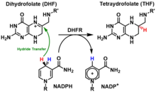 DHFR catalyzes the transfer of a hydride from NADPH to dihydrofolate with an accompanying protonation to produce tetrahydrofolate.[11] In the end, dihydrofolate is reduced to tetrahydrofolate and NADPH is oxidized to NADP+. The high flexibility of Met20 and other loops near the active site play a role in promoting the release of the product, tetrahydrofolate. In particular the Met20 loop helps stabilize the nicotinamide ring of the NADPH to promote the transfer of the hydride from NADPH to dihydrofolate.[16]