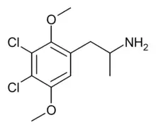 DODC is a psychedelic drug from the substituted amphetamine family which acts as an agonist of the 5-HT2A receptor. It is the 3,4-dichloro derivative of the well known psychedelic drug 2,5-Dimethoxy-4-chloroamphetamine (DOC). DODC was first officially published in a patent filed by Gilgamesh Pharmaceuticals in 2020,[1] though anecdotal reports suggest it had been synthesised by clandestine chemists and its activity established several years prior to this.