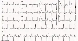 Diagnosis is based on an ECG showing ST-segment depression at the J-point of 1 to 3 mm in leads V1 to V6, with tall and symmetrical T waves.[1] The ST-segment is upsloping and there is also often ST-segment elevation of 0.5 to 2 mm in lead aVR.[1][2] The QRS complex is either normal or slightly wide.[1]