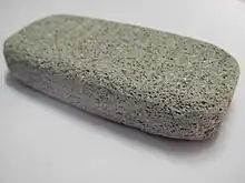 Pumice, which is an igneous rock that is composed of solidified lava that rapidly cools with gas bubbles being trapped inside of it, is commonly used as an exfoliating material.[16] Pumice is a decently abrasive material, making it useful as an exfoliating agent.[16]