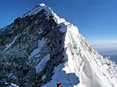 In mountaineering, the death zone refers to altitudes above a certain point where the pressure of oxygen is insufficient to sustain human life for an extended time span. This point is generally tagged as 8,000 m (26,000 ft), where atmospheric pressure is less than 356 millibars (10.5 inHg; 5.16 psi).[1] The concept was conceived in 1953 by Edouard Wyss-Dunant, a Swiss doctor, who called it the lethal zone.[2] All 14 peaks above 8000 m (the "eight-thousanders") in the death zone are located in the Himalaya and Karakoram regions of Asia.