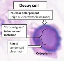 Decoy cells are mostly prevalent in immunocompromised individuals, such as transplant recipients who are treated with immunosuppressive medication in order for their immune system not to reject the foreign transplanted organ. Several viruses mediated the emergence of decoy cells, amongst which cytomegalovirus and polyomavirus. Decoy cells are virus infected urothelial cells with a distinct morphology of enlarged nuclei and intranuclear inclusions. In renal transplant recipients, such cells may be found in up to 40 percent of cases.[1] Decoy cells are clinically relevant since they may be used as a prognostic marker for clinical conditions such as polyomavirus BK-induced nephropathy in renal transplant recipients, and haemorrhagic cystitis in haematopoietic stem cell transplant recipients.[1]