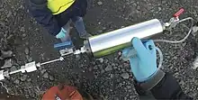Packers are also used in the continental subsurface,[34] along with devices such as the flow-through in situ reactor (FTISR). Various methods are used to extract fluids from these sites, including passive gas samplers, U-tube systems and osmotic gas samplers.[13] In narrow (less than 50 mm) holes, polyamide tubes with a back-pressure valve can be lowered to sample an entire column of fluid.[35][36]