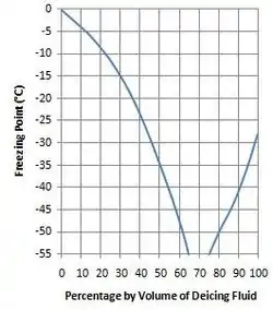 Deicing fluids work best when they are diluted with water. For example, undiluted Dow UCAR Deicing Fluid[10] (Type I ethylene glycol), has a freezing point of −28 °C. Water freezes at 0 °C. However, a mixture of 70 percent deicing fluid and 30 percent water freezes below −55 °C. This is known as the eutectic concentration, where the freezing point of the mixture is at its lowest point, and lower than either of the component substances.