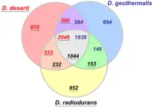 Although all species of the genus Deinococcus are related by definition, they exhibit substantial differences across their genomes. Most species appear to have about 3,000 genes, but only a fraction of them are shared in other species. For example, a 3-species comparison among D. radiodurans, D. deserti, and D. geothermalis shows that about two thirds of each genome is shared by all three species, but close to a third is specific and only found in one of the species (see figure). Once more genomes are included in such comparisons, the core genome will almost certainly be much smaller.[10]