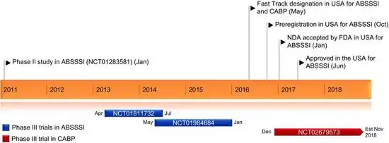 Delafloxacin was approved by the FDA in June 2017, after it was noninferior to vancomycin plus aztreonam in two trials on 1042 patients with acute bacterial skin and skin structure infection.[12] New Drug Applications (NDA) for delafloxacin (Baxdela) 450 mg tablets and 300 mg injections were approved by the FDA in June 2017.[13]