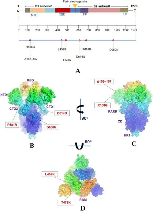 The list of spike protein mutations is: 19R, (G142D), Δ156-157, R158G, L452R, T478K, D614G, P681R, D950N according to GVN,[38] or T19R, G142D, del 156–157, R158G, L452R, T478K, D614G, P681R according to Genscript[39] Four of them, all of which are in the virus's spike protein code, are of particular concern: