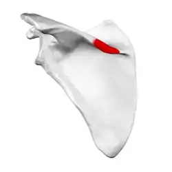 - Medial view of left scapula. Deltoid tubercle shown in red.