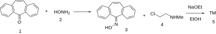 The condensation between Dibenzosuberenone [2222-33-5] (1) and hydroxylamine (2) gives the oxime, [1021-91-6] (3). Base catalyzed attachment of the sidechain by reaction with 2-Chloro-N-Methylethanamine [32315-92-7] (4) completed the synthesis of demexiptiline (5).