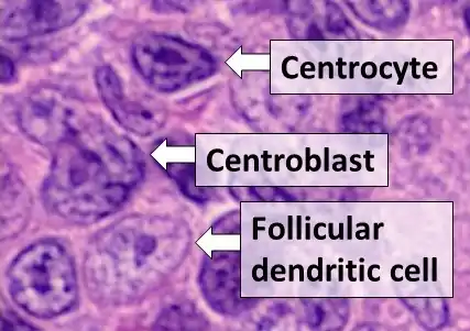 Histologic comparison of cell types in a germinal center, including follicular dendritic cells, H&E stain: