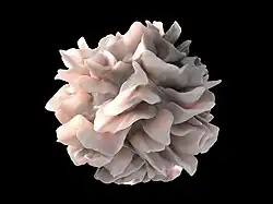 Artistic rendering of the surface of a human dendritic cell illustrating sheet-like processes that fold back onto the membrane surface. Some researchers believe that these sheets, when exposed to HIV, entrap viruses in the vicinity and focus them to contact zones with T cells targeted for infection. These studies were carried out using ion abrasion scanning electron microscopy, a new technology the NIH has been developing and applying for 3D cellular imaging.