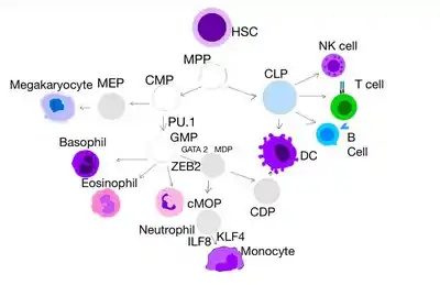 Diagram of hematopoiesis from HSC, showing a separate dendritic cell lineage via CDP (Common Dendritic-cell Progenitor).