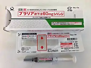 Denosumab, sold under the brand names Prolia and Xgeva, is used to treat osteoporosis, bone cancer, and high calcium due to cancer.[2] It is given by injection under the skin.[2] It is used with calcium supplements and vitamin D.[3]