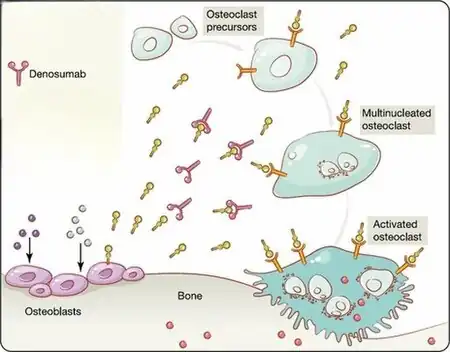 - ↑ Hanley, D. A.; Adachi, J. D.; Bell, A.; Brown, V. (December 2012). "Denosumab: mechanism of action and clinical outcomes". International Journal of Clinical Practice. 66 (12): 1139–1146. doi:10.1111/ijcp.12022. PMID 22967310.