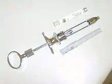 A dental syringe is a syringe for the injection of a local anesthetic.[25] It consists of a breech-loading syringe fitted with a sealed cartridge containing an anesthetic solution.