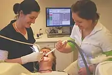 Dental assistants are members of the dental team.[1] They support a dental operator (such as a dentist or other treating dental auxiliary) in providing more efficient dental treatment. Dental assistants are distinguished from other groups of dental auxiliaries (such as dental therapists, dental hygienists and dental technicians) by differing training, roles and patient scopes.[2][1]