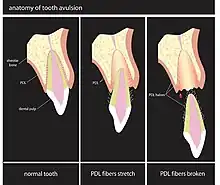 Dental avulsion is the complete displacement of a tooth from its socket in alveolar bone owing to trauma.[1] Normally, a tooth is connected to the socket by the periodontal ligament. When a tooth is knocked out, the ligament is torn.[2]