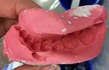 A dental impression is a negative imprint of hard and soft tissues in the mouth from which a positive reproduction, such as a cast or model, can be formed. It is made by placing an appropriate material in a dental impression tray which is designed to roughly fit over the dental arches. The impression material is liquid or semi-solid when first mixed and placed in the mouth. It then sets to become an elastic solid, which usually takes a few minutes depending upon the material. This leaves an imprint of a person's dentition and surrounding structures of the oral cavity.