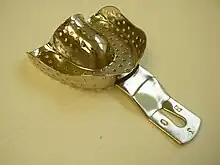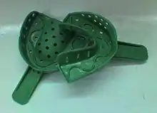 • Be rigid enough to endure the force of the dental impression material being positioned in the mouth. Flexure of the tray under force would cause the tray to be distorted, so when the impression tray is removed the impression would be narrower and distorted. This is particularly important for plastic stock trays.
