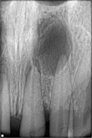 Xray showing peri-radicular radiolucency and bone loss caused by an odontogenic infection under the roots of two anterior teeth