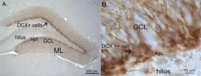 The subgranular zone (in rat brain). (A) Regions of the dentate gyrus: the hilus, subgranular zone (sgz), granule cell layer (GCL), and molecular layer (ML). Cells were stained for doublecortin (DCX). (B) Closeup of subgranular zone, located between the hilus and GCL,[31] a site of adult neurogenesis.