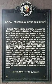 The first dentist in Spanish Philippines to open a dental clinic to practice true dentistry was José "Capitan Cheng-cheng" Arevalo.[1] Arevalo was the first Filipino dentist.[2] Arevalo was assisted by his wife who was skilled in "gold craftsmanship".[2] Arevalo's clinic was in Quiapo, Manila. Arevalo later became a partner of Monsiuer M. Fertri, a dentist from France, who opened another dental clinic in Quiapo, Manila[1] in 1858, after residing in Hong Kong.[2] Fertri needed Arevalo's expertise as a prosthetist.[2]