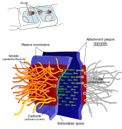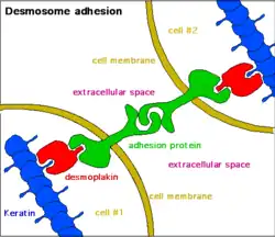 - 1 2 Garrod, David; Chidgey, Martyn (2008-03-01). "Desmosome structure, composition and function". Biochimica et Biophysica Acta (BBA) - Biomembranes. Apical Junctional Complexes Part I. 1778 (3): 572–587. doi:10.1016/j.bbamem.2007.07.014. PMID 17854763.