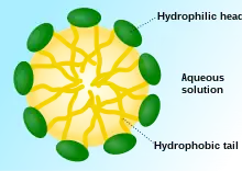 Detergent molecules aggregate to form micelles, which makes them soluble in water. The hydrophobic group of the detergent is the main driving force of micelle formation, its aggregation forms the hydrophobic core of the micelles. The micelle can remove grease, protein or soiling particles. The concentration at which micelles start to form is the critical micelle concentration (CMC), and the temperature at which the micelles further aggregate to separate the solution into two phases is the cloud point when the solution becomes cloudy and detergency is optimal.[4]