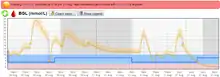 The Standard day data plots, see example 2, shows that trends are easy to see. The blood glucose readings are plotted at their level versus the time of day. Multiple days are plotted on top of each other, creating a scatter of points. In the example shown, it is easy to see the glycemic excursions to high blood sugars following breakfast and lunch. Once identified, this can be improved by using a faster acting insulin, or injecting insulin 20 minutes before eating, or by selecting carbohydrates to eat that are slower to peak in the bloodstream.